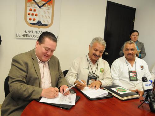 Hermosillo, Sonora; 19 de diciembre de 2012.- En seguimiento a la Estrategia Integral de Seguridad Vial’, el Ayuntamiento de Hermosillo, firmó un convenio de colaboración con el Sindicato de Transportes, Taxistas, Similares, Conexos y Trabajadores en General del Estado de Sonora (SITTAXSCES), con el fin de disminuir los accidentes viales relacionados con la conducción punible.