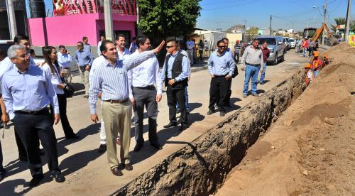 Acompañado por el Alcalde Alejandro López Caballero recorrió la obra en las calles Emiliano Zapata y Francisco Villa, que lleva una avance del 70%, y urgió a los trabajadores a que la terminen con prontitud para no causar molestias a los vecinos.