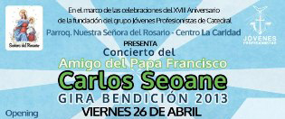 En el marco de las celebraciones del XVIII Aniversario de la fundación del grupo Jóvenes Profesionistas de Catedral y la Parroquia de Nuestra Señora del Rosario de esta ciudad, presentan el Concierto del Amigo del Papa Francisco, CARLOS SEOANE, en su GIRA BENDICIÓN 2013, este viernes 26 de abril a las 7:00pm en el Centro La Caridad, ubicado en Lucrecia Ruíz de Ayón esq. con María Amparo, Fracc. La Caridad.