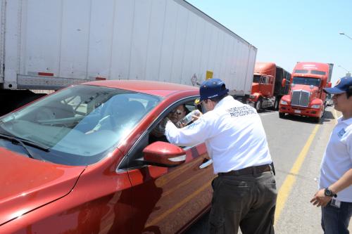 De igual forma, en el puesto ubicado en la calle Fresno, personal de la UEPC recorre en motocicletas las largas filas de vehículos que se acumulan, con la intención de llevar alimento y agua a los conductores.