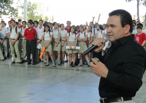Para despedir a los alumnos próximos a graduarse y desearles mucho éxito en la continuación de su formación académica, así como para hacer entrega simbólica de un vestido y un traje de graduación a estudiantes destacados, José Humberto López Caballero, presidente de Progreso por Sonora A.C., participó en la ceremonia de lunes cívico de la escuela secundaria #12, “Profesor Juan Ceballos Ayala”. La directora del plantel, maestra Lilia Ceballos, agradeció a López Caballero, quien será el padrino de graduación de la generación 2010-2013, por las atenciones brindadas a las diversas gestiones hechas a nombre de la institución educativa. Cabe destacar que las autoridades escolares de la secundaria #12, “Profesor Juan Ceballos Ayala”, reconocieron públicamente el año pasado los apoyos brindados por José Humberto López Caballero y la asociación Progreso por Sonora, en temas como Escuadrón Vial de los Padres de Familia, material deportivo, patrocinios para la celebración del Día del Maestro, así como rehabilitación y pintura del inmueble y de los campos deportivos, entre otros. José Humberto López Caballero, agradeció la distinción a nombre de todos los integrantes de Progreso por Sonora, y felicitó a alumnos y maestros por el gran nivel académico que ostenta la escuela secundaria. “Ustedes forman parte de una escuela secundaria de gran prestigio, pero se lo han ganado gracias al esfuerzo que han realizado día a día en conjunto con sus maestros. Ahora que están a punto de iniciar una nueva etapa es muy importante que siempre pongan en alto el nombre de esta su escuela, pero que sobre todo den siempre su mejor esfuerzo para que sean jóvenes de provecho para la sociedad”, dijo. Además realizó una entrega simbólica de un vestido y un traje de graduación a los alumnos Juan Pablo López Aguilar y Alejandra Gálvez García, quienes participaron en una convocatoria de aprovechamiento escolar.