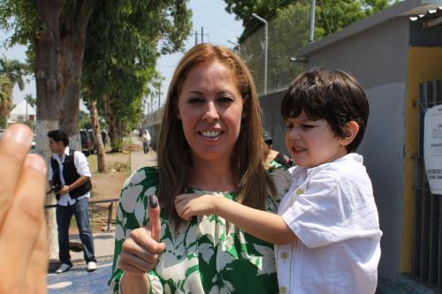 Un buen ambiente al momento de votar la candidata del PRI, Rossana Coboj, enseña su dedo y al Jr en brazos. Pero en esa casilla y esa hora, (11), apenas habia 100 votos depositados.