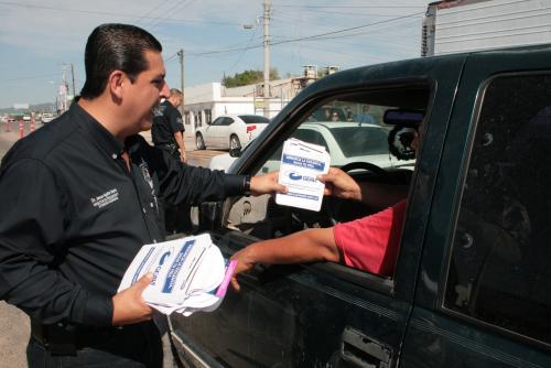 Este martes por la mañana, personal de la Jefatura de Policía Preventiva y Tránsito Municipal se instalaron en el crucero de entrada de San Pedro el Saucito para repartir los volantes informativos sobre la prevención y erradicación de la violencia intrafamiliar.
