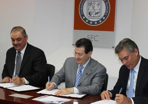 El delegado de Sedesol, Rosario Rodríguez Quiñones, y el secretario de la SEC, Jorge Luis Ibarra Mendívil, acompañados del secretario de Desarrollo Social en Sonora, Luis Alberto Plascencia Osuna, signaron el convenio de colaboración.