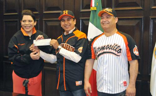 Entre gestos de camaradería y cordialidad, el alcalde Alejandro López Caballero y la presidenta del DIF Hermosillo, Silvia Félix de López Caballero, recibieron al presidente municipal de Navojoa, Natanael Guerrero López, quien se calzó casaca y gorra oficiales de los Naranjeros y donó una quincena de su sueldo a beneficio de los hermosillenses.