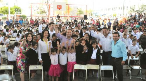 El alcalde Alejandro López Caballero entregó a alumnos y maestros de la escuela primaria "Leona Vicario", los trabajos terminados de rehabilitación y equipamiento de sus instalaciones recreativas y deportivas, en los cuales se invirtieron 2 millones 465 mil pesos.