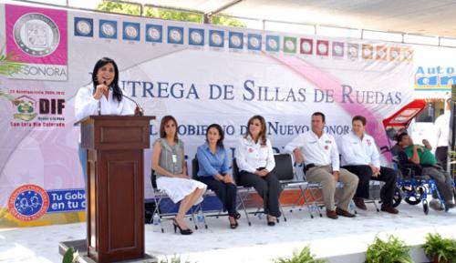 Acompañada por el Alcalde de esta frontera, Manuel de Jesús Baldenebro y la Presidenta del Sistema DIF local, Perla Elizabeth Peralta, Dagnino de Padrés hizo entrega de 25 sillas de ruedas a personas con algún tipo de discapacidad que acudieron al Programa “Tu Gobernador en tu colonia”, el pasado mes de abril.