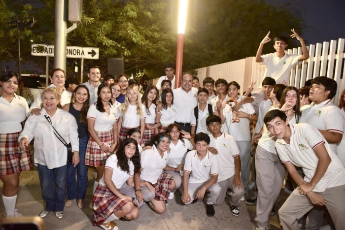 Recibieron a Toño Astiazarán decenas de alumnas y alumnos y el director del plantel César Antonio Tristán y la señora Rebeca Mesa Dessens, presidenta del comité vecinal CRECES de La Manga y juntos corearon la cuenta regresiva con que se encendieron las 33 luminarias LED tipo bolardo de este corredor.