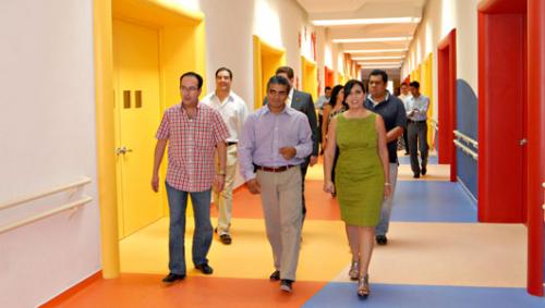 Acompañada por John Swanson Moreno y Jorge Alcántara Aguileta, la Señora Iveth Dagnino visitó las diferentes áreas donde atenderán a los pequeños con discapacidades neuromusculoesqueléticas y observó los avances en construcción, equipamiento, distribución, informática y seguridad.