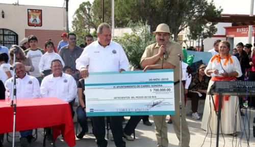 Ahí entregó al Presidente Municipal Marco Antonio Mojardin un cheque simbólico por el monto de 700 mil pesos para varias peticiones del ayuntamiento, como la adquisición de una ambulancia, pavimentación de la calle Oaxaca final y la terminación de la construcción de la Plaza Bicentenario.