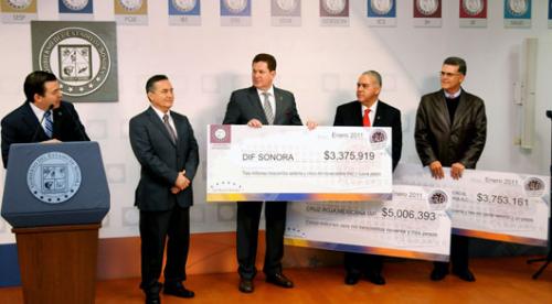 Hermosillo, Sonora, a 02 de febrero de 2011.- El Gobierno del Estado entrego para su distribución a Cruz Roja Estatal, DIF Sonora y al Patronato Estatal de Bomberos un total de 12 millones 535 mil 473 pesos producto de las aportaciones voluntarias de los contribuyentes, captadas en el primer mes de recaudación por concepto de reemplacamiento y tenencia vehicular, lo demuestra el compromiso y la generosidad de los sonorenses en apoyar a estas instituciones.