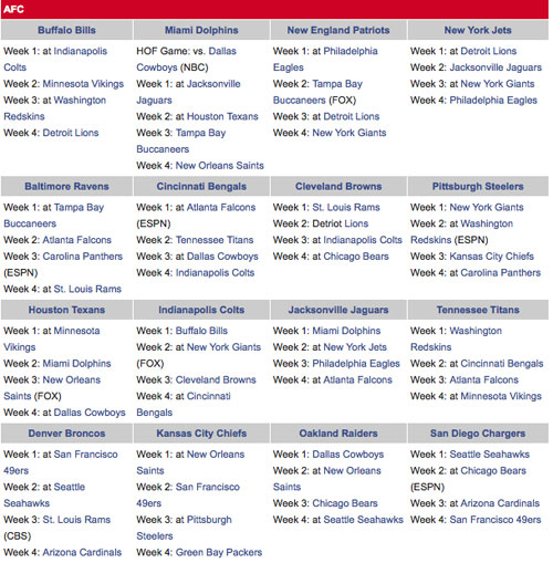 Los Cuervos de Baltimore, actual Campeón de la Liga, tendrá como primer rival a los Bucaneros de Tampa Bay. Los Patriotas de Nueva Inglaterra iniciarán actividad en Filadelfia ante las Águilas, mientras que los Jets de Nueva York irán contra los Leones de Detroit.