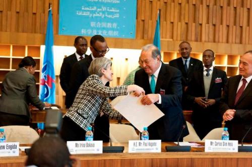 El presidente Kagame y Carlos Slim asistieron a la Unesco en su calidad de copresidentes de la Comisión de Banda Ancha para el Desarrollo Digital, cuya onceava reunión fue realizada en las oficinas de la Unesco en París del 26 al 27 de febrero.