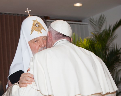 El Papa Francisco y el patriarca ortodoxo de Moscú, Cirilo I, se dieron hoy un histórico abrazo en la sala presidencial del aeropuerto José Martí de La Habana, en el primer encuentro entre un pontífice romano y un patriarca ruso.