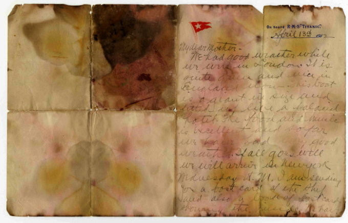 Holverson escribió la carta a su madre mientras viajaba en el infortunado barco con su esposa Mary. Tres de los cuatro lados en las que estaba dividida la hoja de papel, se muestra la tinta casi intacta, salvo por algunas manchas de colores en la última página, por haber estado más expuesta al agua salada del mar.