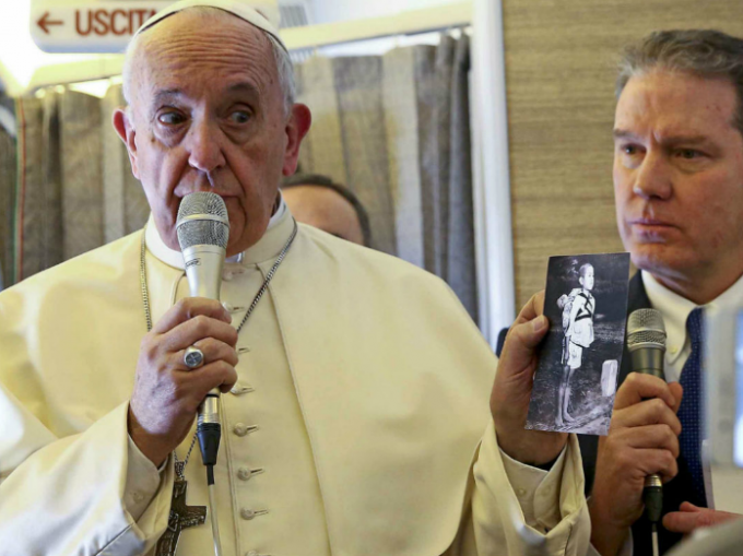 Francisco comentaba con esas declaraciones las razones por las que distribuyó a los 70 periodistas que lo acompañan en el vuelo una foto tomada en Nagasaki tras la explosión en 1945 de la bomba atómica con la leyenda "fruto de la guerra".
