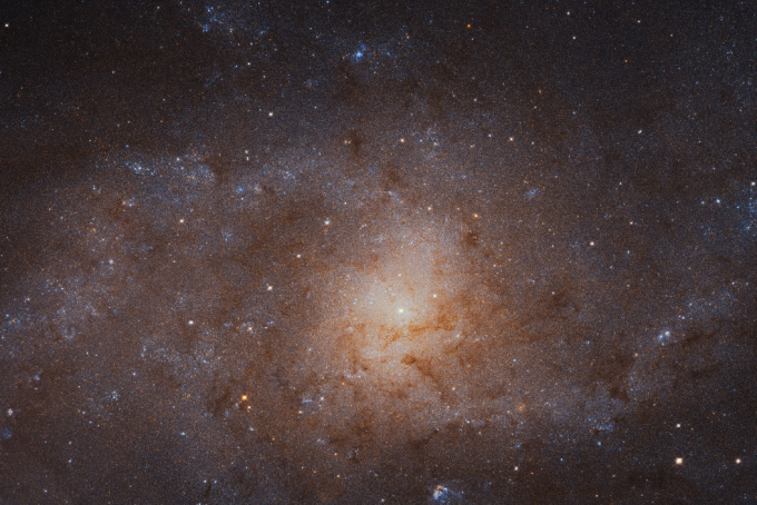 Este mosaico, segunda mayor imagen publicada por Hubble, muestra la región central de la galaxia del Triángulo y sus brazos espirales interiores, donde se aprecian millones de estrellas, cientos de cúmulos estelares y brillantes nebulosas.
