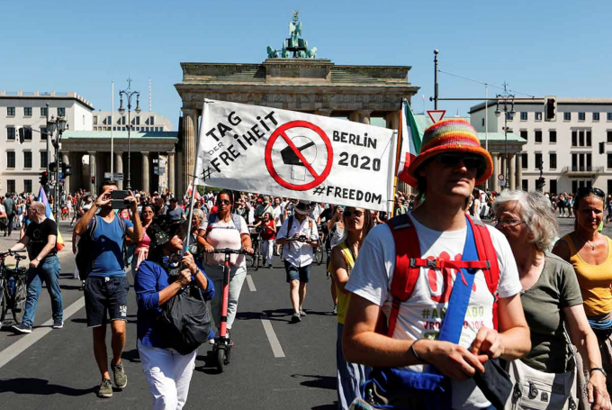 La policía de Berlín, que pedía con altavoces a los manifestantes que respetaran las medidas de seguridad, anunció en Twitter una denuncia contra los organizadores por "no respetar las reglas de higiene".
