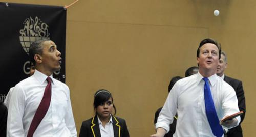 Londres, Inglaterra 24 de mayo de 2011.- El presidente de Estados Unidos, Barack Obama, y el primer ministro del Reino Unido, David Cameron, alteraron hoy su programa previsto para dirigirse a una escuela donde conversaron con alumnos y jugaron una partida de ping-pong.